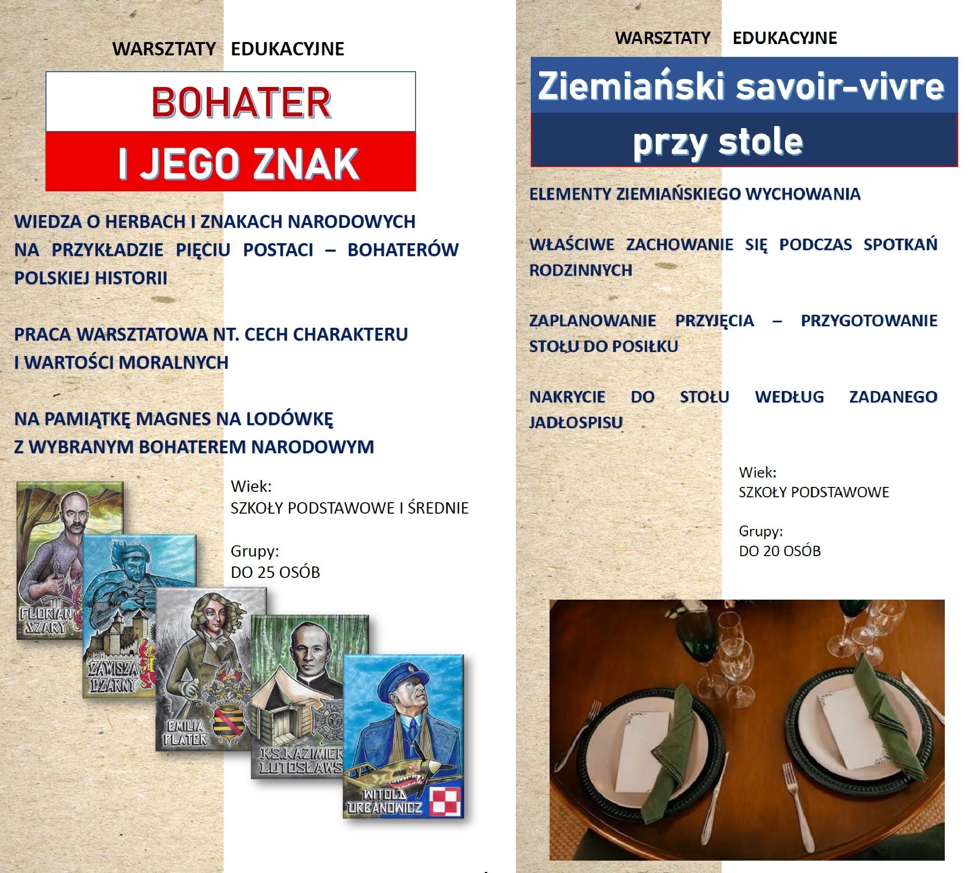 • „Ziemiański savoir-vivre przy stole” – warsztaty: elementy ziemiańskiego wychowania; właściwe zachowanie się podczas spotkań rodzinnych; zaplanowanie przyjęcia – przygotowanie stołu do posiłku, nakrycie do stołu według zadanego jadłospisu. Szkoły podstawowe.